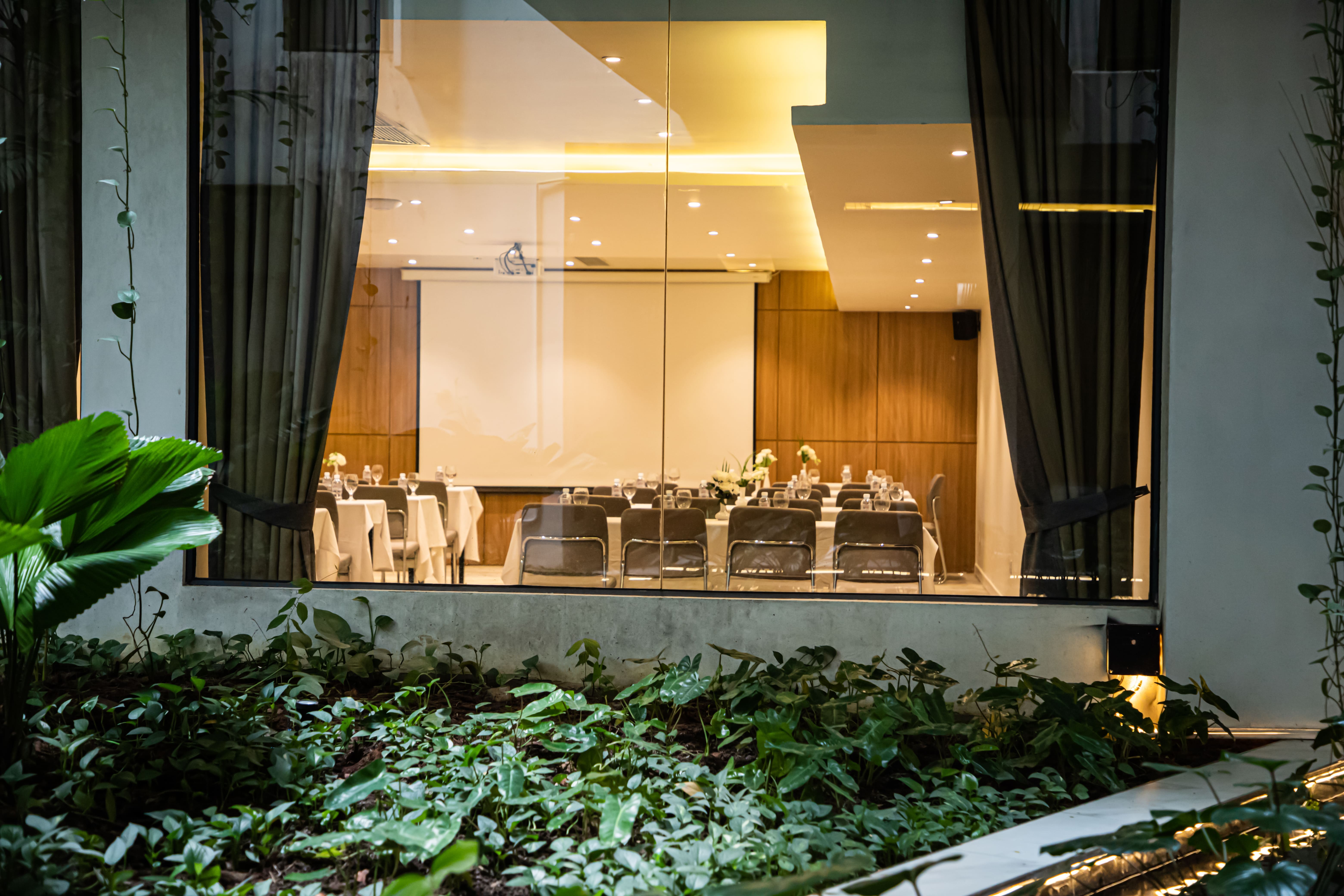 A large venue with modern equipment and view on the lush garden, ideal for conferences, seminars and presentations.